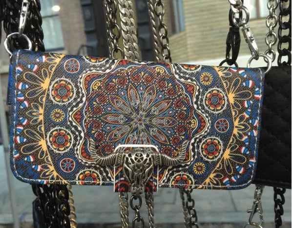 Tibetty is zen-like with it's boho pattern print. A silver metal Tibetan steer skull rests atop the magnetic tab close to watch over your phone